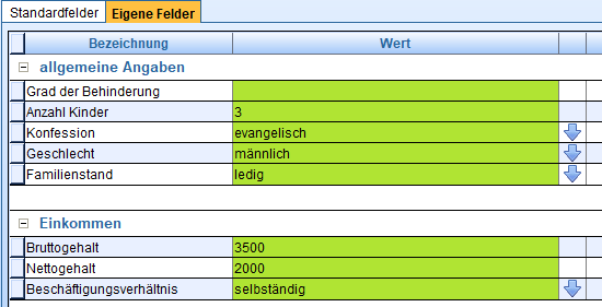 Sie können entweder einen beliebigen Text in Spalte Wert eingeben oder den kleinen blauen Button verwenden, um eine Auswahl möglicher Werte zu öffnen (dazu müssen natürlich auch mehrere Werte in der Einrichtung des Feldes angegeben worden sein).