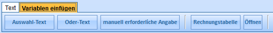 In diesem Kapitel wird die grundlegende Bedienung erläutert. Die Erklärungen zu den speziellen Variablen für Auswahl-Texte, Oder-Texte, manuell zu machende Angaben und der Rechnungstabelle finden Sie hier.