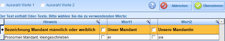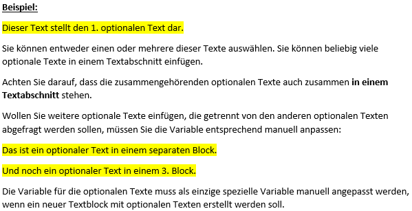 a) Variable für Auswahl-Text: Ein Auswahltext besteht aus mehreren Texten, die durch eine Variable voneinander getrennt werden. Vor der Erstellung des Dokuments werden Sie aufgefordert die Texte auszuwählen, die im Dokument erscheinen sollen. Sie können dabei einen oder mehrere Texte auswählen.