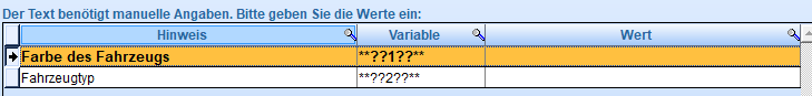 c) Variable für manuell erforderliche Angaben: Für diese Variablen werden vor Erstellung beliebige Werte abgefragt und eingesetzt.